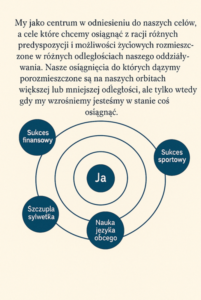W mojej głowie natychmiast narodził się obraz, który postanowiłem przelać na papier. Przedstawiłem siebie – „Ja” – w centrum kręgów symbolizujących różne sfery mojego życia i oddziaływania. Każdy z tych kręgów to inny cel: sukces finansowy, sportowy, relacje, szczupła sylwetka, nauka języka obcego – u każdego wygląda to nieco inaczej. Te cele krążą wokół mnie na różnych orbitach – jedne są bliżej, inne dalej – w zależności od moich obecnych możliwości, predyspozycji, inteligencji emocjonalnej ale i poziomu rozwoju osobistego.